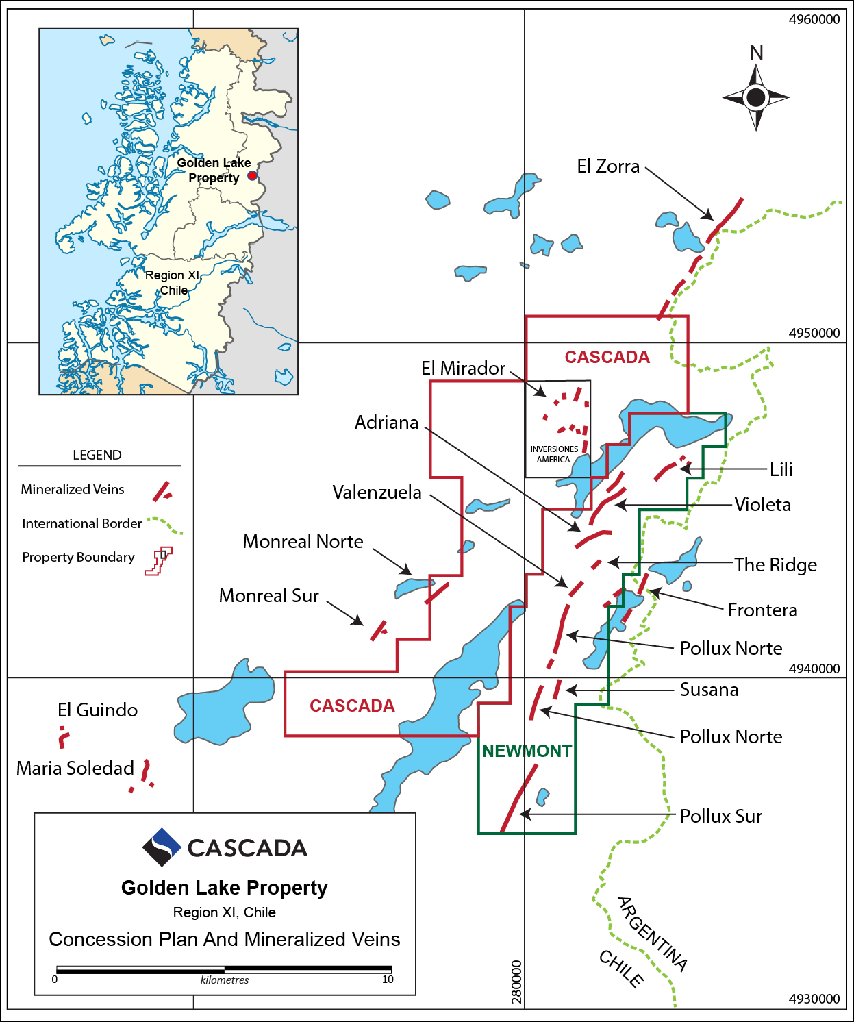 Toronto, Ontario, October 19, 2022 – Cascada Silver Corp. (CSE:CSS) ("Cascada") is pleased to announce that it has staked the Golden Lake Property (the “Property”) located 1,350 kilometers south of Santiago in Chile’s Region XI. The Property, located adjacent to the western border of concessions owned by Minera Newmont Chile Ltda (see attached location map), overlies a portion of the Pollux Gold District which hosts of series of eroded gold-silver bearing veins identified by Homestake Chile SA (“Homestake”) in the early 1990’s.