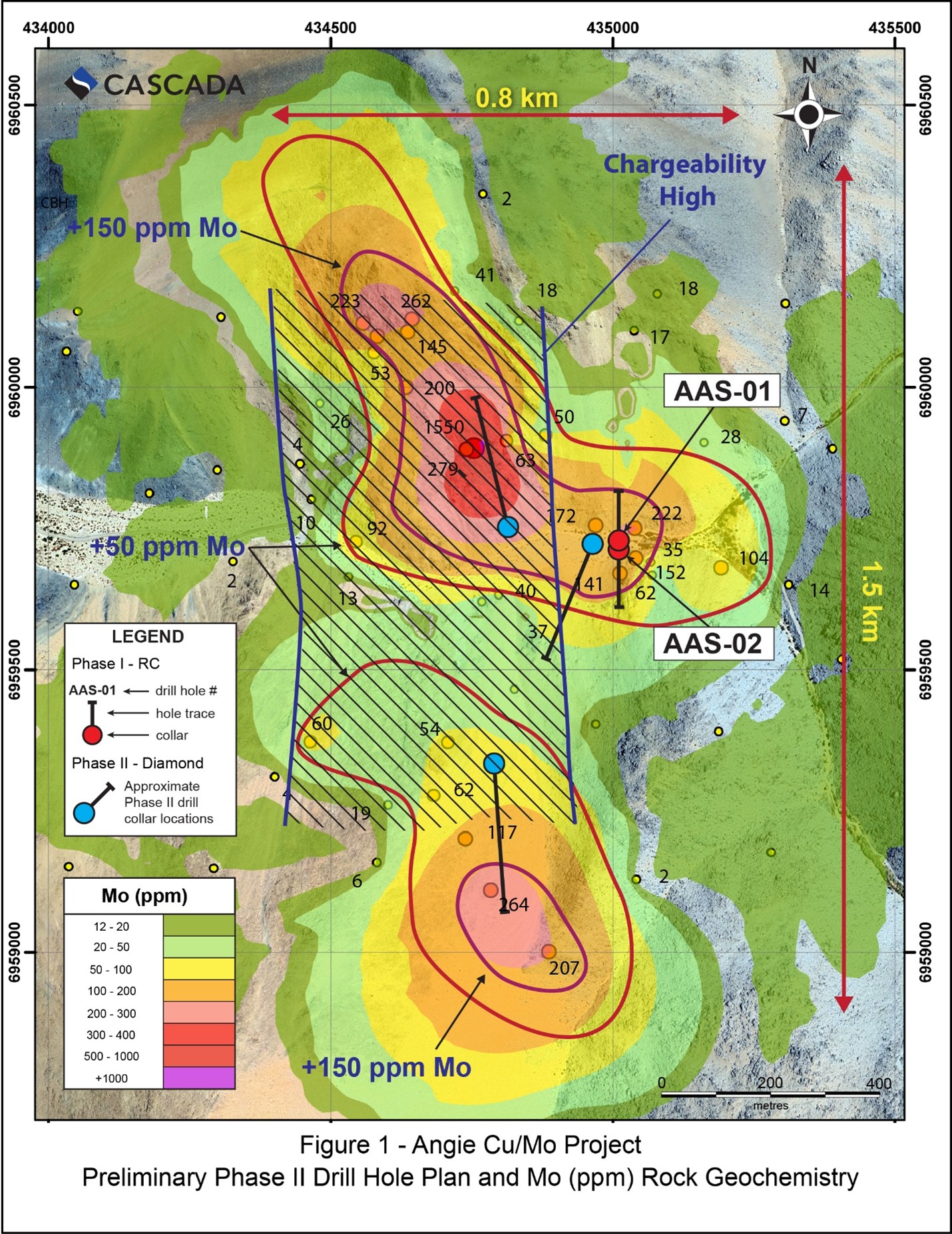 The diamond drill program will follow up on Cascada’s recently completed, two hole, reverse circulation drill program which confirmed the presence of a mineralized porphyry system at Angie returning significant mineralized intervals including 26 metres grading 713 parts per million (“ppm”) molybdenum with a higher grade, 8-metre interval grading 1,208 ppm molybdenum at the end of drill hole AAS-02 (see Table 1). In addition to molybdenum, which is typically found within the margins and upper levels of copper molybdenum porphyry systems, copper mineralization was observed in the RC chips increasing in content to depth although no significant copper intervals were returned.