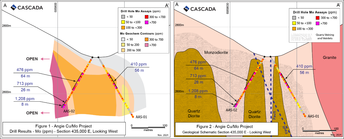 Mo grades in AAS-02 increase downhole toward a quartz diorite porphyry which is considered the likely source of the mineralization. The 26 m interval grading 713 ppm at the end of the hole remains open at depth and to the southwest along strike. Despite observed copper mineralization increasing with depth, no significant copper assays were returned suggesting that we are still on the margins or upper levels of the porphyry system. Further drilling is required, either deeper or along strike toward the quartz diorite porphyry, interpreted as the source of the mineralization and alteration.