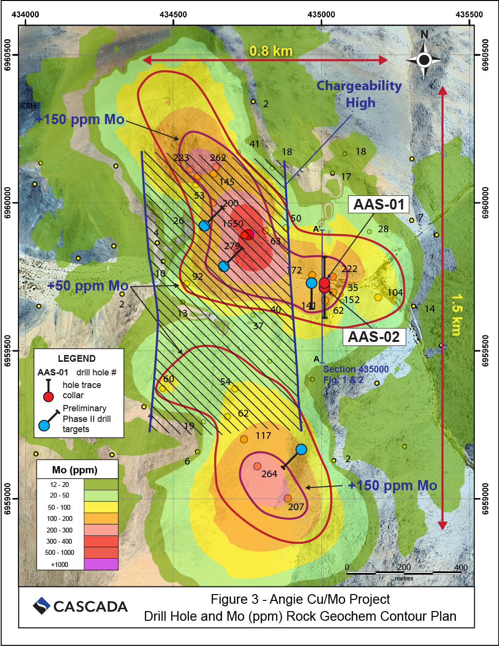 ATERRA announced the results of its Phase I RC drill program on November 20, 2024. Drilling encountered significant intervals of molybdenum mineralization with drill hole AAS-02 returning 26 m grading 713 ppm Mo including 8 m, at the end of the hole, grading 1,208 ppm Mo. See the Table for the assay highlights as well as the Sections. The Mo intersections remain open in all directions. Unfortunately, due excessive water pressures encountered in both drill holes, neither hole was completed to its targeted depth of 300 m with hole AAS-01 terminated at 210 m and AAS-02 lost at 176 m.